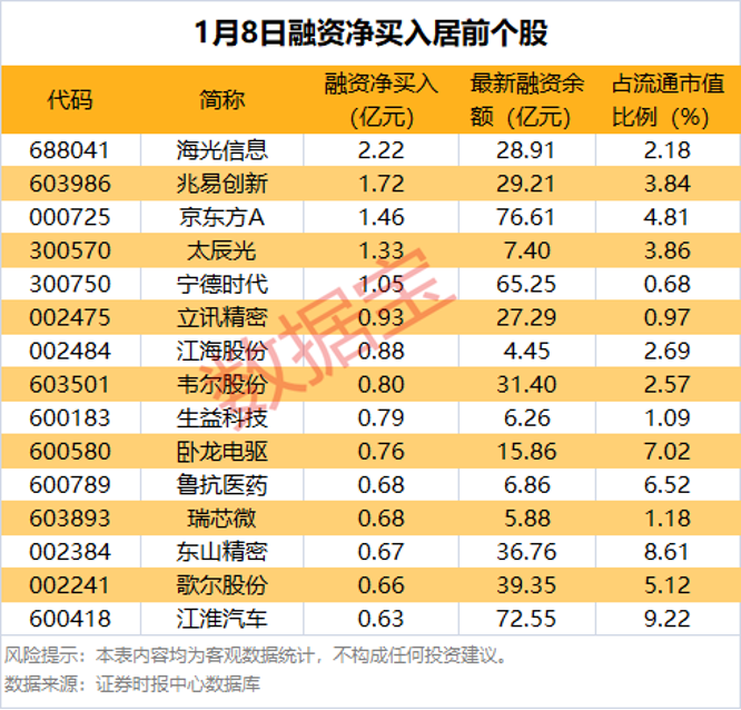 具体到个股来看,1月8日获融资净买入千万元以上的A股有220股,其中5股融资净买入额超1亿元。