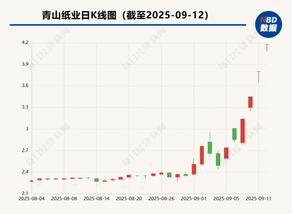 9月12日,青山纸业(600103)(SH600103,股价4.18元,市值93.67亿元)再次涨停。