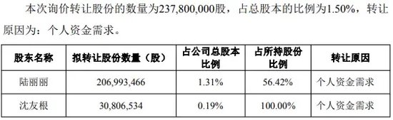 陆丽丽是初次转让公司股份,本次转让的股份数额为2.07亿股,占公司总股本的1.31%,占所抓股份的比例为56.42%。而沈友根则是第三次转让公司股份,转让的股份数额为0.31亿股,占公司总股本的0.19%,本次转让之后将不再抓有公司股份。