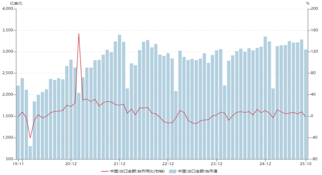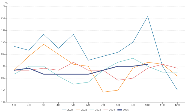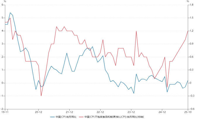 国度统计局11月9日公布的数据披露,10月CPI同比0.2%,预期-0.1%,前值-0.3%;环比高涨0.2%。中枢CPI接续回升,同比高涨1.2%,涨幅指示第6个月扩大,为2024年3月以来最高。PPI同比下落2.1%,预期-2.2%,前值-2.3%,环比高涨0.1%。海关总署公布数据披露,2025年10月以好意思元计价出口同比-1.1%,前值8.3%;进口同比1%,前值7.4%。